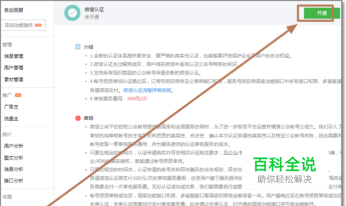 首先进入使用自己的公众号进入微信公众平台,在管理界面,设置菜单下面,点击:“微信认证”进入微信认证界面,点击右上角的“开通”。