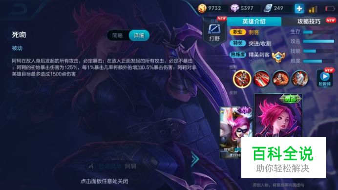 好了,先来看看阿珂的被动,死吻,阿珂从敌人背面发起的攻击,也就是偷袭,必定暴击,从正面发起的攻击必定不暴击,所以阿珂贴身消耗是不可能的,只有走偷袭路线。阿珂原始暴击伤害是125%,每增加1%暴击率增加0.5%暴击伤害,对野怪一次攻击最多只有1500点伤害。