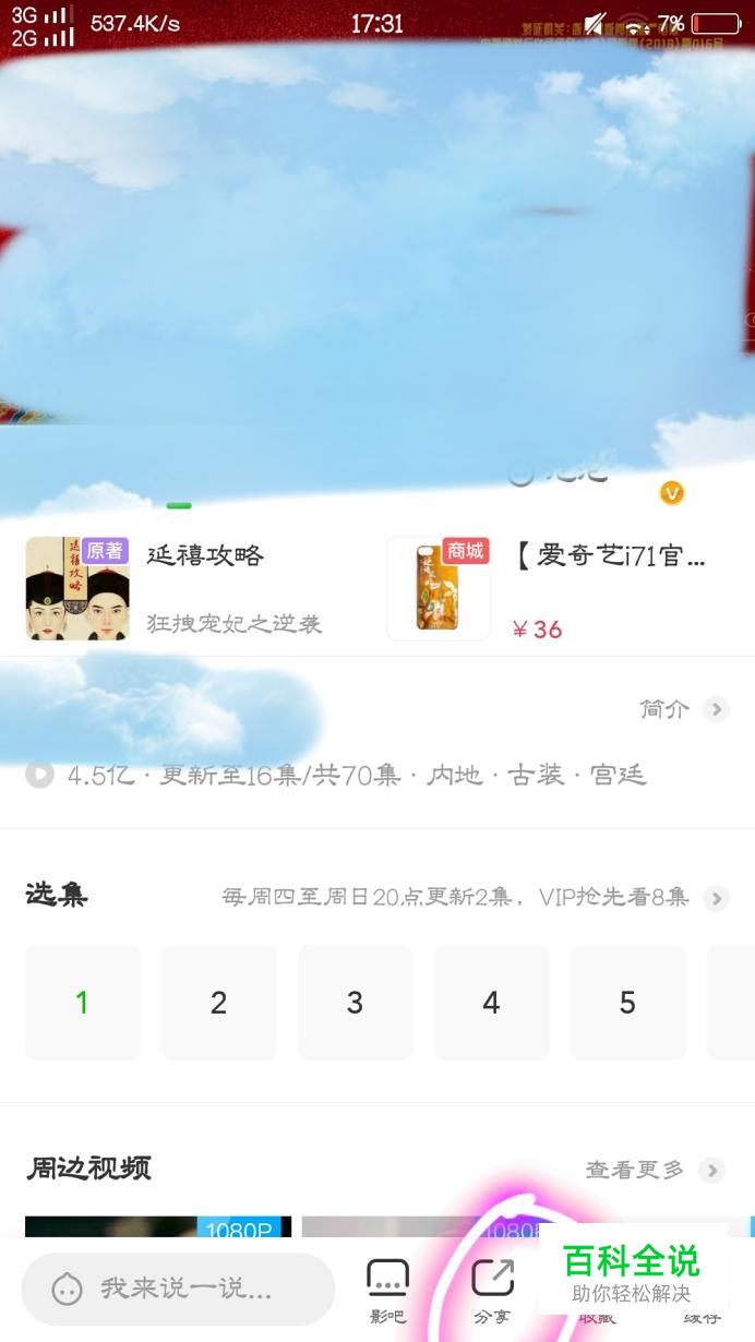接下来,找到自己想看的电影或电视剧,来到该页面后,点击屏幕下方的“分享”点击后,往屏幕右方滑动,有个“复制链接”我们点击复制该视频的链接