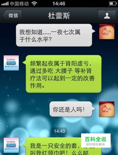 模式三:陪聊式对话微信 营销方式:现在微信开放平台已经提供了基本的会话功能,让品牌用户之间做交互沟通,但由于陪聊式的对话更有针对性,所以品牌无疑需要大量的人力成本投入。 案例:杜蕾斯 以杜蕾斯为例,杜蕾斯微信团队专门成立了8人陪聊组,与用户进行真实对话。延续了杜蕾斯微博上的风格,杜蕾斯在微信中依然以一种有趣的方式与用户“谈性说爱”。据杜蕾斯代理公司时趣互动透露,目前除了陪聊团队,还做了200多条信息回复,并开始进行用户的语义分析的研究。【图3】