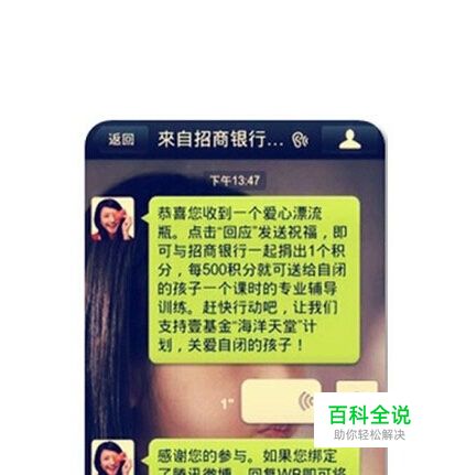 模式一:活动式微信——漂流瓶 营销方式:微信官方可以对漂流瓶的参数进行更改,使得合作商家推广的活动在某一时间段内抛出的“漂流瓶”数量大增,普通用户“捞”到的频率也会增加。加上“漂流瓶”模式本身可以发送不同的文字内容甚至语音小游戏等,如果营销得当,也能产生不错的营销效果。 案例:招商银行的“爱心漂流瓶” 活动期间,微信用户用“漂流瓶”功能捡到招商银行漂流瓶,回复之后招商银行便会通过“小积分,微慈善”平台为为自闭症儿童提供帮助。根据观察,在招行展开活动期间,每捡十次漂流瓶便基本上有一次会捡到招行的爱心漂流瓶。不过,介于漂流瓶内容重复,如果可提供更加多样化的灵活信息,用户的参与度会更高。