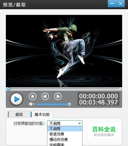 一、添加视频,设置慢动作视频效果 首先,点击“添加视频”按钮,导入舞蹈视频。接着进入“预览/截取”对话框,点击“魔术功能”选项卡,选择“慢动作效果”。在“减速速率”栏拉动滑杆,滑杆越往右,视频就越慢~