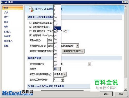 第2步,在打开的Excel2007“Excel选项”对话框中切换到“常用”选项卡,在“新建工作簿”区域分别设置使用的字体和字号,并单击“确定”按钮,如图2009061211所示。 图2009061211 设置Excel2007默认字体和字号