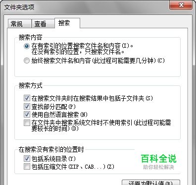 不搜索子目录 减少搜索时间 Win 7搜索功能的强大还包括它不仅可以搜索文件名,还可以搜索文件内容。如果你只记得文件当中的部分内容而不记得文件名,那么这个功能无疑会在很大程度上帮助你。不过实际的情况是,文件内容搜索用户用到的时候并不多,毕竟记住文件名比记住文件内容要容易得多。因此在默认情况下,Win 7在搜索没有索引的目录时将只搜索文件名,而不搜索文件内容。 除此之外,为了让搜索更快,我们还可以进行进一步的设定,选择不搜索子目录,并设定搜索内容关键字完全匹配等,这样就可以进一步减少搜索时间,加快搜索速度。 为了达到更好的效果,Win 7默认是要搜索文件夹以及文件夹中包含的子目录的,但如果我们确认文件所在的文件夹,就可以选择不包括子目录搜索,从而加快速度。相比之下,选择关键字的完全匹配可能效果更为明显,也可以有效筛选搜索结果。因为如果关键字部分匹配的话,可能会搜索出很多包含关键字中部分内容的文件,而这些文件往往并不是我们想要的。 修改方法很简单,在系统的开始菜单的搜索框中输入“文件夹选项”,确认后即可打开“文件夹选项”设置窗口(如下图所示),然后在“搜索方式”栏当中选择去掉“在搜索文件夹时在搜索结果中包含子文件夹”和“查找部分匹配”前的勾选即可。