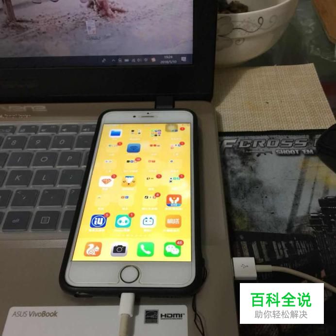 然后将我们的手机和电脑用数据线连接起来,如下图所示。