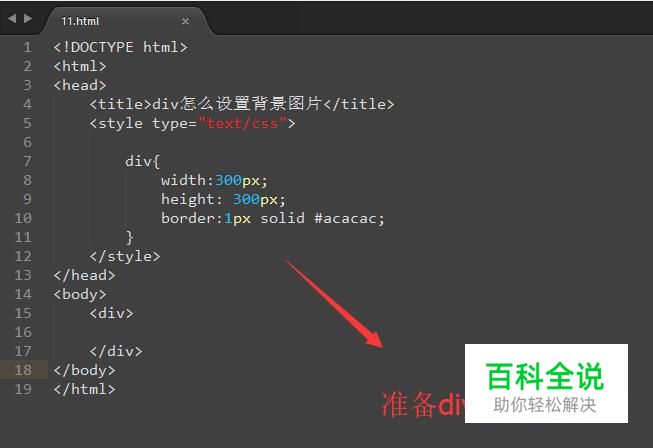 然后我们在html的body区域添加一个div,并且给div设置一下宽高以及边框的样式,如下图所示