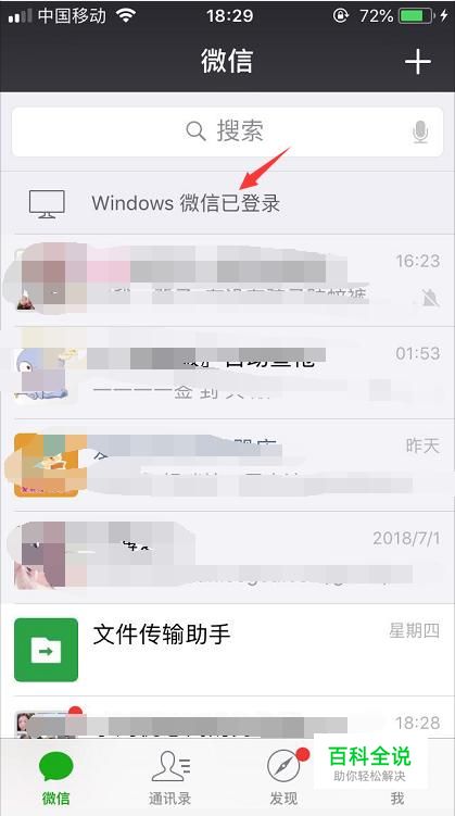 登录成功后,我们的手机微信消息页面的最上方会显示Windows已登录。