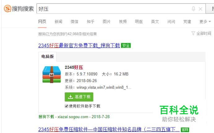 打开搜狗搜索,搜索“2345好压”,将其安装到电脑上面。