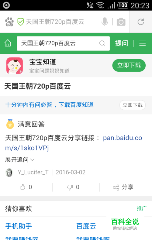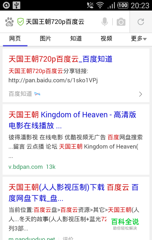 手机浏览器上百度搜索想要看的电影。比如“天国王朝百度云”