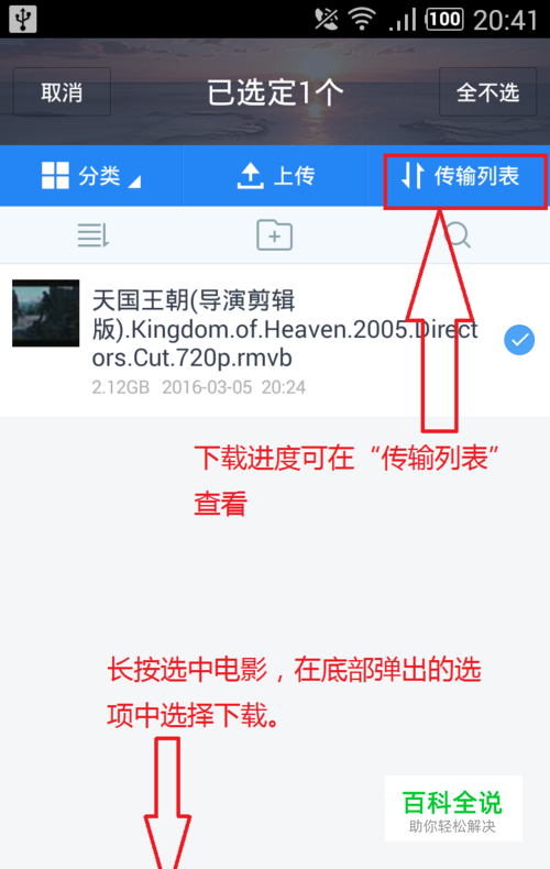 下载该视频:选中电影,在手机底部弹出的选项中选择”下载“即可。下载进度可在”传输列表“查看