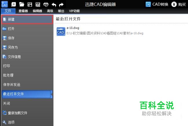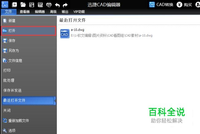 双击桌面上的CAD编辑器快捷图标,打开进入软件的操作界面,在界面左侧点击“文件”——“打开”,按照路径找到并打开CAD文件。