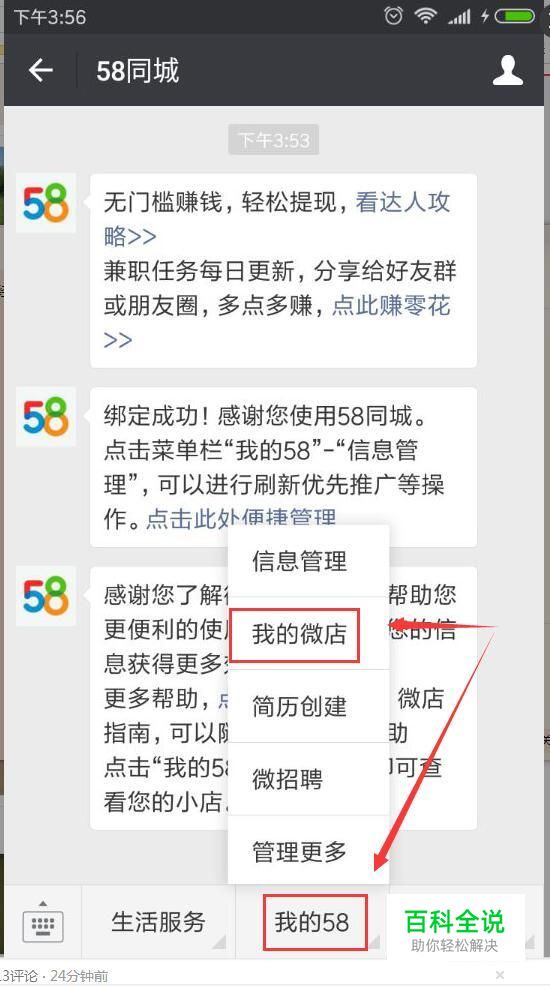 关注微信帐号后,这时可以点击下方的“我的58”按钮,这时会出现一个列表框,直接在列表框中点击“我的微店”按钮,进入个人微店窗口内进行设置与添加相关的产品信息。