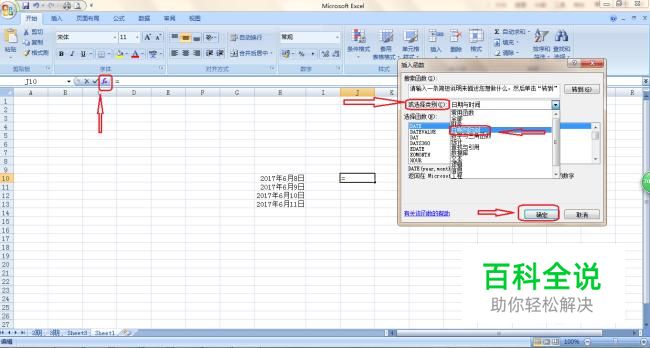 点击插入函数按钮“fx”,在对话“或选择类别”下拉菜单中选择“日期与时间”,点击确定