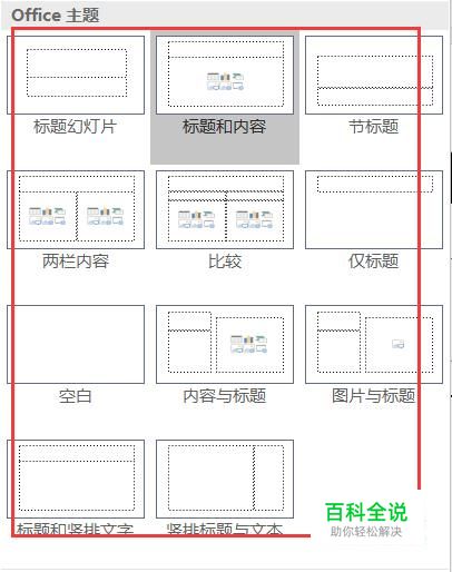 在新建幻灯片下拉菜单会出现11种常用版式我们随机添加一些。为设计母版做铺垫。单击版式添加即可。