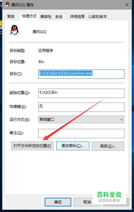 在“快捷方式”选项下点击下方的“打开文件所在位置”,然后出现QQ程序的源文件。