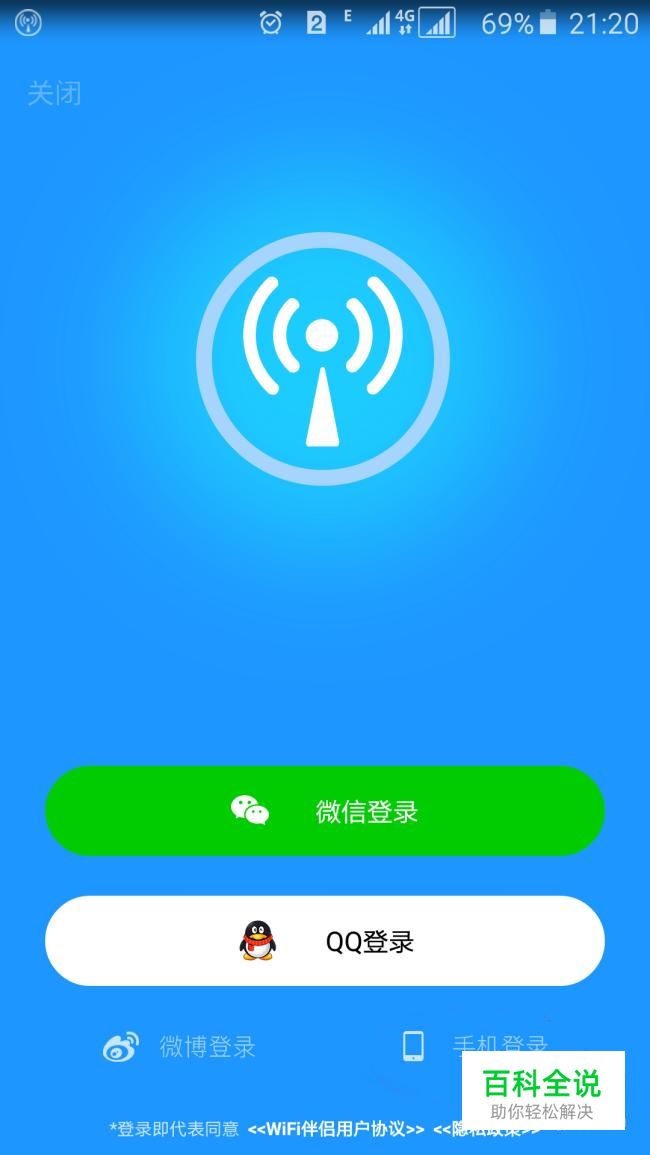进入WiFi伴侣APP,点击微信或QQ登录,进入页面后点击确定登录。
