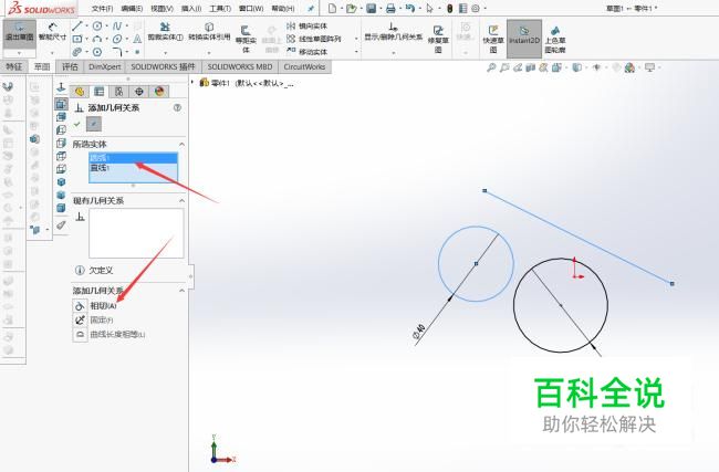 接下来就是约束圆和直线的位置关系了。依次选中圆和直线,然后约束为相切。