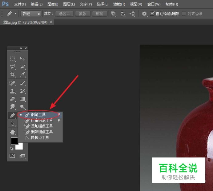 沿着酒坛的边缘,使用钢笔工具描出轮廓。 注:路径是不可以直接使用的,因此我们需要将它转为选区。