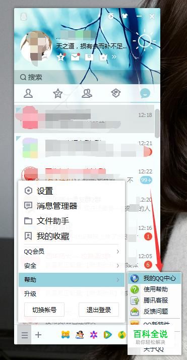 然后我们点击“帮助”-进入“我的qq中心”。如图所示: