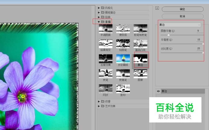从滤镜库里面找打“素描”里面的“撕边”,选择并设置如图所示参数。