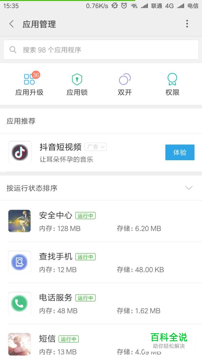 进入安全中心的应用管理界面,单击“权限”标签