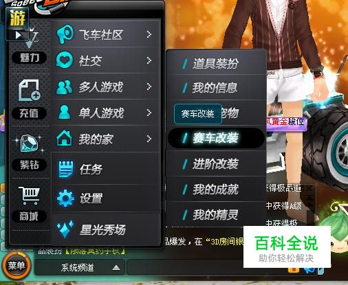 首先,登录QQ飞车,在菜单-我的家里找到赛车改装