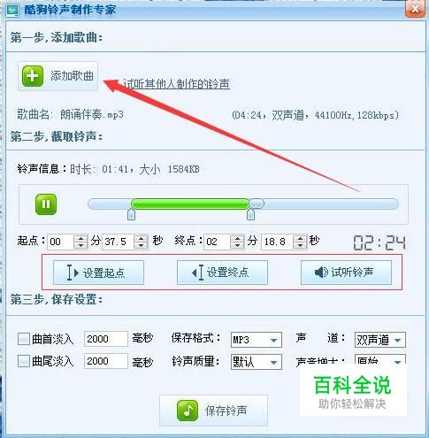 点击添加歌曲,将喜欢的音乐上传,然后设置起点和终点,设置完成后可以点击试听铃声,满意后点击保存铃声。