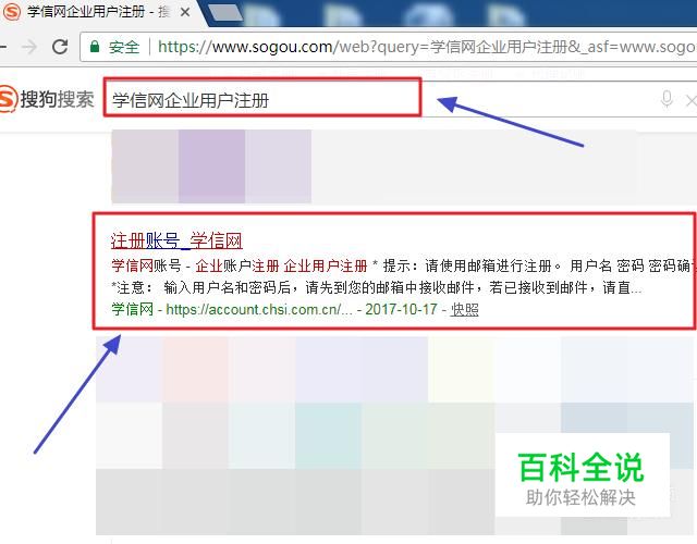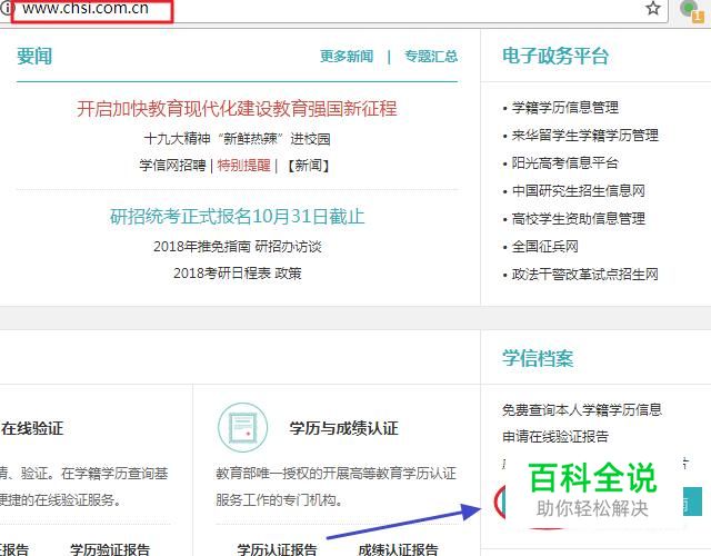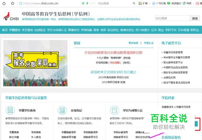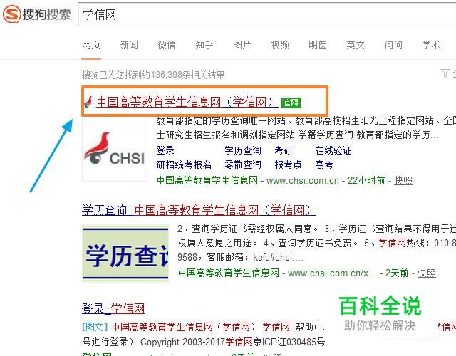 在搜索引擎界面找到有"官网"标志后缀的学信网, 点击标题链接打开网页。记住学信网的官方网址是:www.chsi.com.cn,不要点到别的网站注册去了。