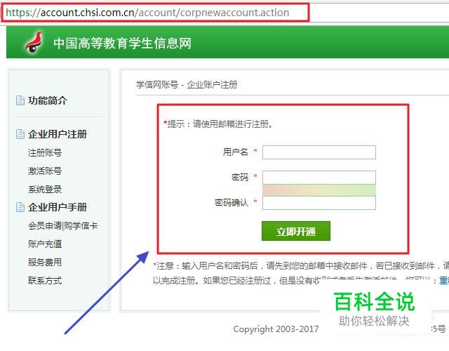 进入学信网企业用户注册界面后,使用邮箱进行注册,填写好用户名和密码,点击"立即开通"按钮。随后,学信网会发送验证邮件到企业用户的邮箱。