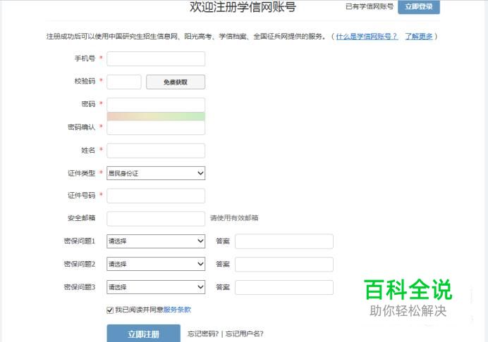 进入学信网的个人用户注册界面,依次仔细填写手机号、登录密码、个人身份信息、邮箱、密保信息等注册信息。信息填写完毕后,仔细检查信息有没填写错误,特别是身份证号码有没漏写号码,确认无误后点击"立即注册"按钮即可。