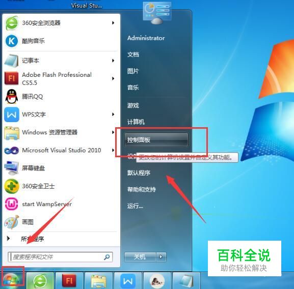 打开控制面板 点击电脑左下角的【开始】图标,在弹出的上拉菜单中,点击【控制面板】,如下图所示: