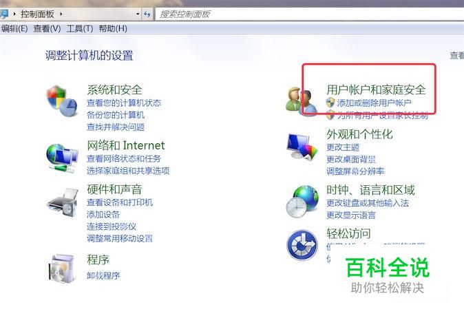 打开控制面板后,点击上面的‘用户账号和家庭安全’