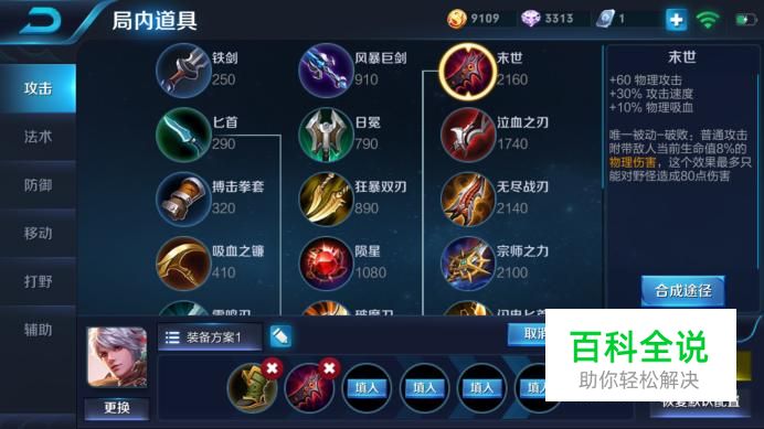 第二件装备:末世 在前期为百里守约提供攻击力、攻击速度,增加战斗力,还有物理吸血为他提供续航能力,末世被动能在前期很好的打堂坦克。