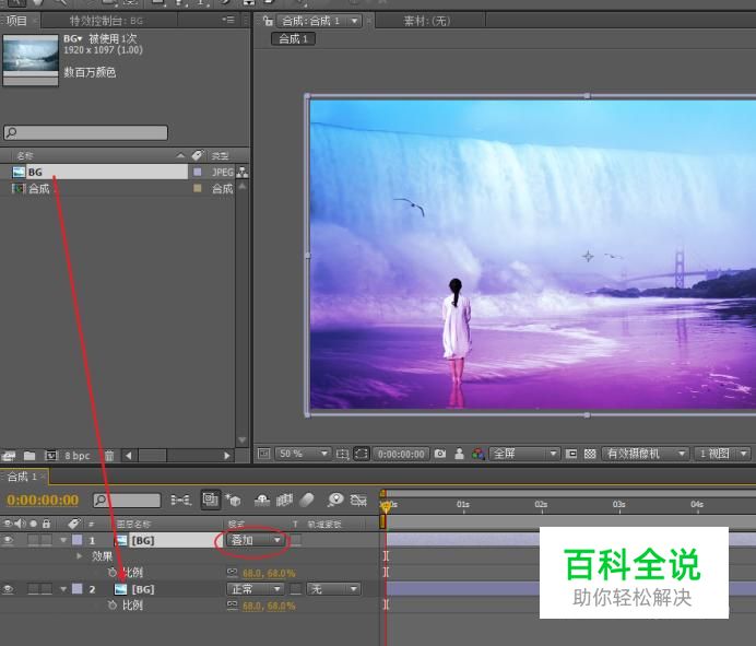 再次将背景层从项目面板拉到时间线面板的图层的最底层,记得调整比例与上层保持一致。 将顶层图层的混合模式设为:叠加,以快速生成渐变的效果。