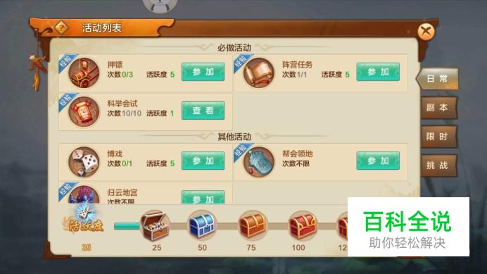 进入挑战活动界面在,在必做活动中点击“英雄榜”参加,每日可参与2次,会获得5点活跃度。