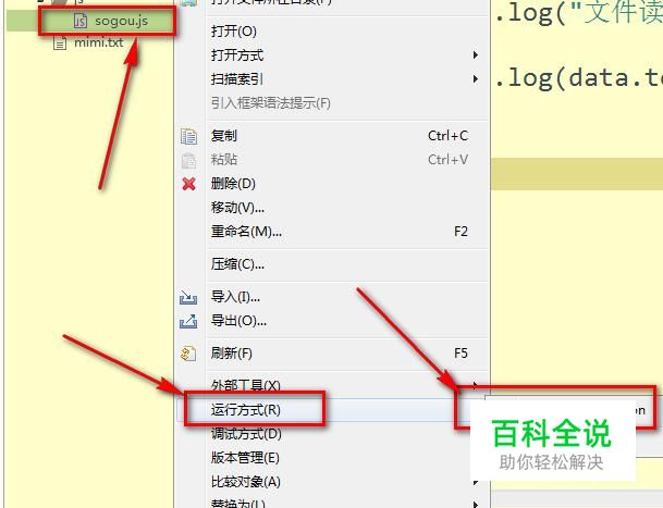 接着运行这个程序,在JS文件上面单击右键,然后运行为nodeApplication就OK了。