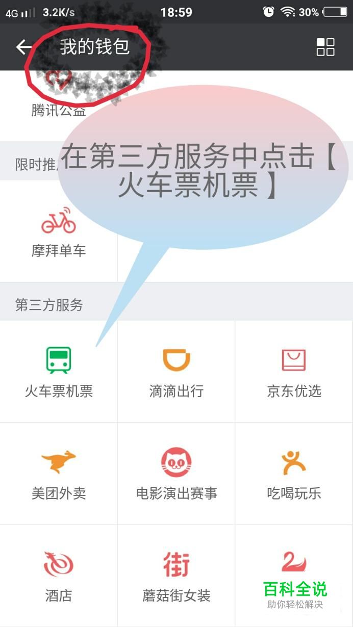 然后会出现下图的页面,在页面中的第三方服务里面找到【火车票机票】,并点击,如下图所示
