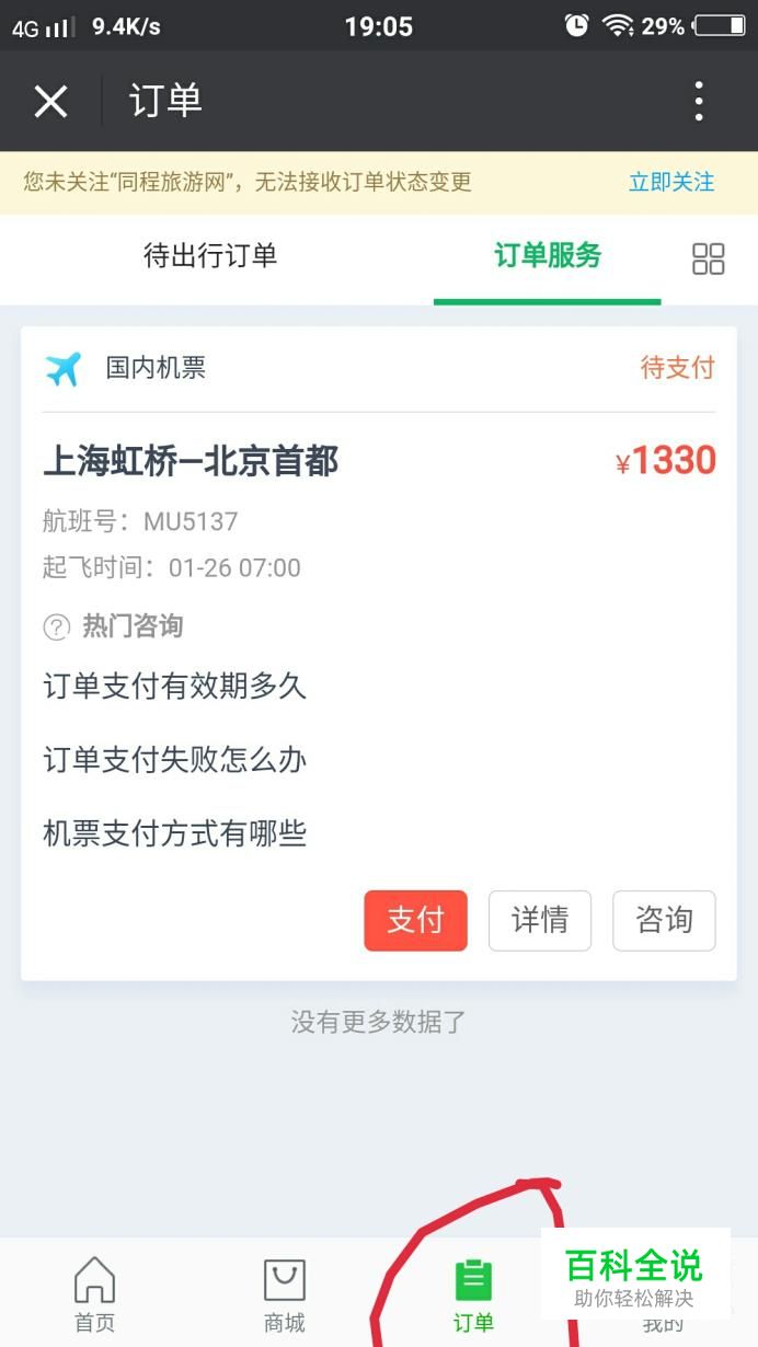 最后点击付款,就好了,如下图所示。买好以后可以返回在在点击【火车票机票】进入的页面的订单中查询刚刚购买好的机票
