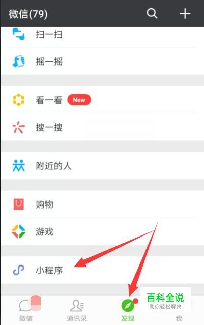 打开微信app,点击下方的“发现”选项,并在界面里找到“小程序”