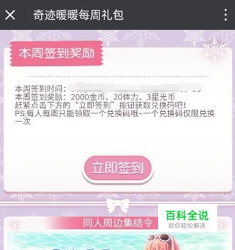 每日签到。 在奇迹暖暖的微信公众号上每日坚持签到同样可以获得礼包,累计签到一个月就可以获得35个钻石和一些金币。
