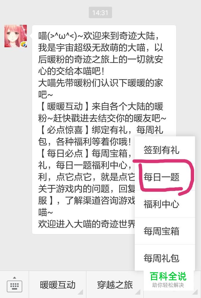 每周礼包。 在奇迹暖暖微信公众号同样可以参与“每周礼包”地活动,顾名思义每周只能参与一次,奖品礼包比每日一题更为诱人,每周的礼品不一样,但是基本上都会有钻石的奖励。
