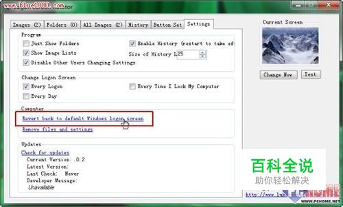 启动后在 Images 或者 Folders 标签里右键添加单张图片或者某个文件夹内所有图片,选择一张你喜欢的点击右侧“Change Now”即可。 Button Set标签里可以选择登录界面文字阴影和登录按钮的样式。Settings标签里可以设置定时更换背景以及恢复默认背景(下图红框),定时更换有三种方式,每次登录(Every Logon)、每次锁定电脑和每天更换。