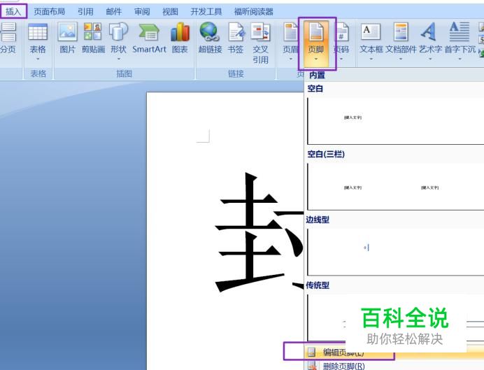 点击工具栏中的插入,点击页脚的下拉箭头,然后点击编辑页脚;