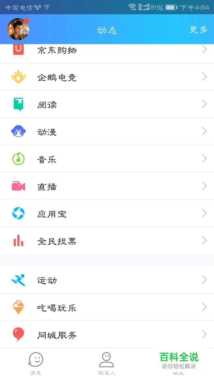 首先进入手机QQ的界面,点击右下角的动态,向下翻找到运动,点击它。