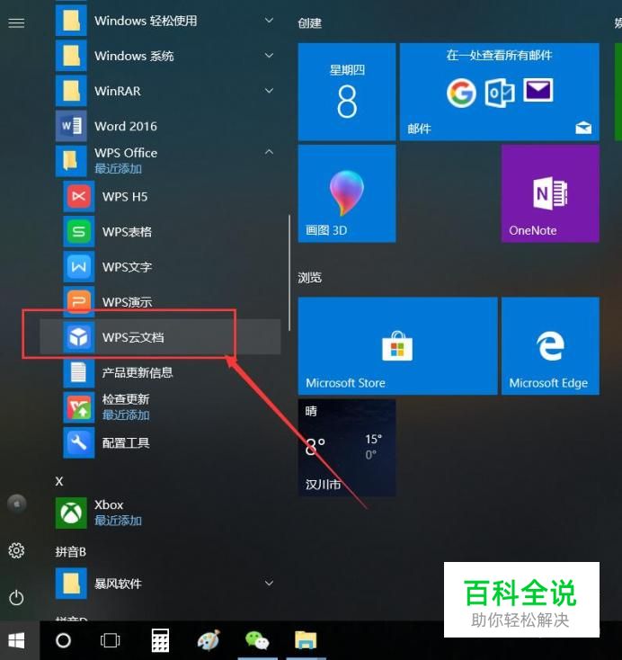 首先,我们打开Win10系统开始菜单,找到“WPS Office-WPS云文档”软件快捷方式项目。