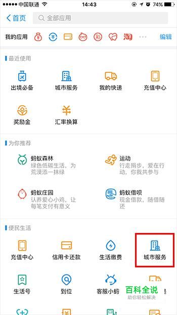 登陆支付宝,在首页面搜索”城市服务“,进入下一个步骤。