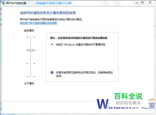 增强的UAC(用户帐户控制) UAC这个在Vista时代饱受争议的功能却依然在Windows7系统得以延续,与之前不同的是原来只有“打开”“关闭”两种操作选择,在Win7当中变为可以在四个安全等级之间自由调节,这样就满足了不同用户的需求,可以让用户自由取舍。不过,在实际的使用当中为了一时的方便而关闭UAC也确实是一件很危险的事情。