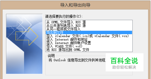 在Outlook信箱中,选择“文件”中的“打开”,然后点击“导入”,然后会出现如下对话框: 选择“导出到文件”,点击“下一步