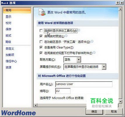 第2步,在打开的“Word选项”对话框中,取消“常用”选项卡中的“选择时显示浮动工具栏”复选框,并单击“确定”按钮即可。