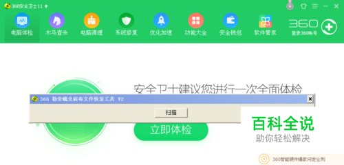 重启电脑后进行全盘扫描,彻底清除勒索病毒(杀毒并不会修改病毒留下的桌面壁纸,需要自行设置喜欢的壁纸)。然后在360安全卫士主界面点击“勒索病毒恢复”图标,打开“360 勒索蠕虫病毒文件恢复工具V2”,点击扫描按钮: